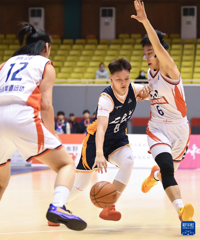 12月22日,石家庄英励队球员柏雪(中)在比赛中带球突破。