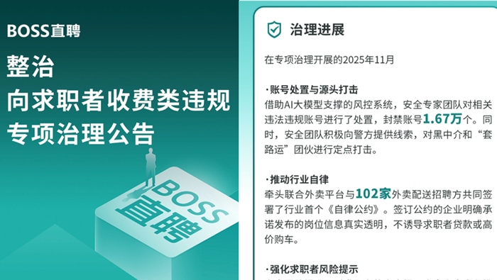 BOSS直聘:單月封禁1.67萬涉“套路收費”類賬號,推送400萬次風險提示
