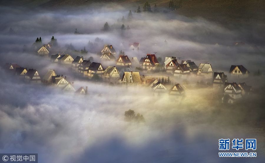 1月10日訊(具體拍攝時間不詳),波蘭皮耶尼內山脈的一個村莊被濃霧籠罩,攝影師站在對面山上拍攝的景觀如童話世界一般,色彩繽紛的房子在濃霧中若隱若現仿若仙境。(圖片來源:視覺中國)