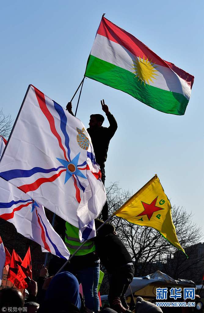 當(dāng)?shù)貢r(shí)間2018年3月3日,德國(guó)柏林,當(dāng)?shù)孛癖娕e行游行,抗議土耳其對(duì)敘利亞阿夫林地區(qū)的庫(kù)爾德人采取軍事行動(dòng)。(圖片來(lái)源:視覺(jué)中國(guó))
