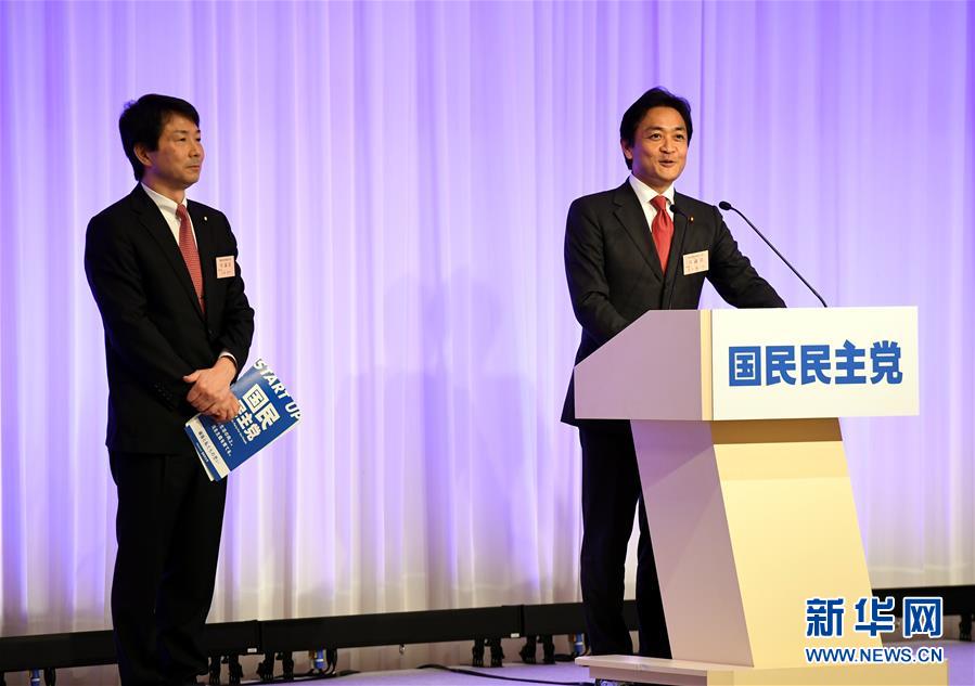 5月7日,日本在野黨希望之黨黨首玉木雄一郎(右)在東京舉行的國(guó)民民主黨建黨大會(huì)上講話。新華社記者馬平攝