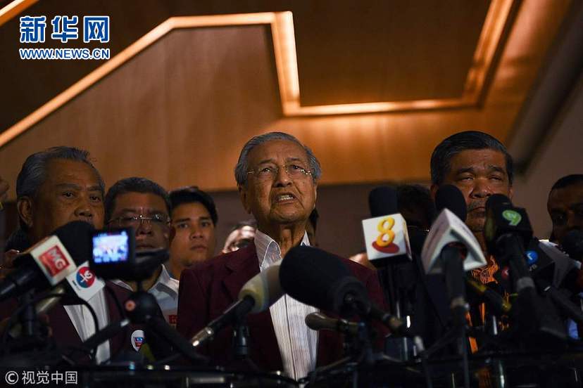 當(dāng)?shù)貢r(shí)間2018年5月9日,馬來西亞吉隆坡,馬哈蒂爾代表希望聯(lián)盟召開新聞發(fā)布會(huì)。9日,馬來西亞國會(huì)大選結(jié)束。10日凌晨官方點(diǎn)票結(jié)果顯示,前總理馬哈蒂爾(Mahathir)帶領(lǐng)的希望聯(lián)盟取得112席簡(jiǎn)單多數(shù)國會(huì)議席,足以籌組政府及勝出大選,并終結(jié)執(zhí)政國民陣線長達(dá)60年的管治?,F(xiàn)總理納吉布領(lǐng)導(dǎo)的國民陣線僅獲得76席。(圖片來源:視覺中國)