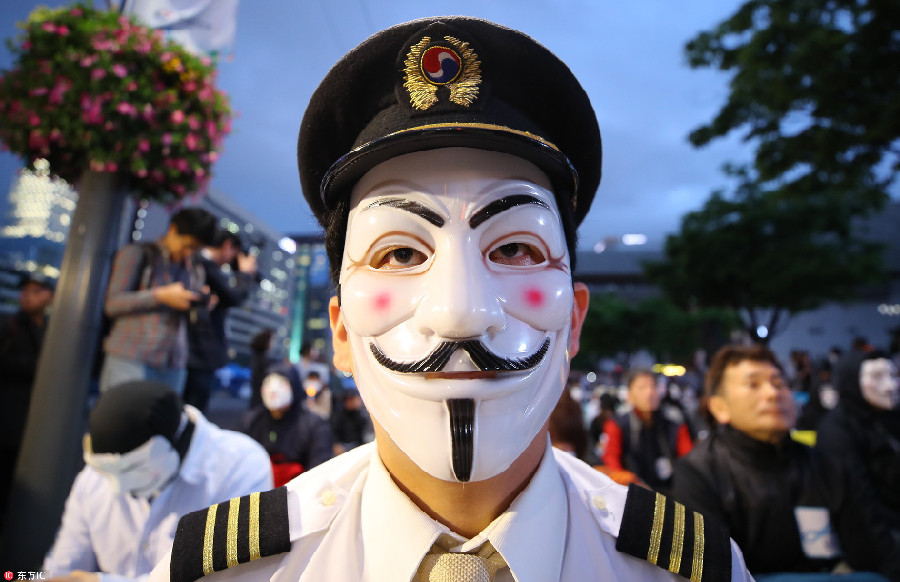 當(dāng)?shù)貢r間2018年5月18日,韓國首爾,大韓航空有限公司的飛行員戴著蓋伊·??怂姑婢?,在首爾市區(qū)集會抗議,反對大韓航空會長兼首席執(zhí)行官趙亮鎬及其家庭。
