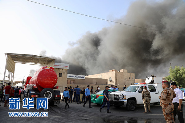 6月10日,在伊拉克首都巴格達(dá),伊拉克安全人員和消防人員在火災(zāi)現(xiàn)場工作。新華社發(fā)(哈利勒·達(dá)伍德 攝)