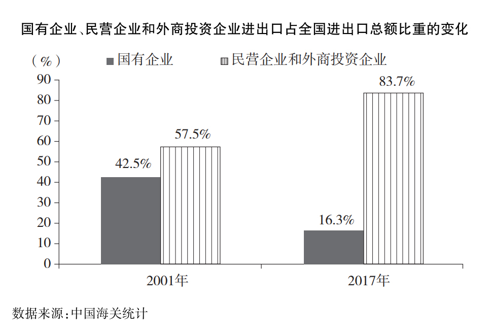 全面放開外貿(mào)經(jīng)營權(quán)。促進(jìn)經(jīng)營主體多元化,激發(fā)各類企業(yè)開展貿(mào)易的積極性。自2004年7月起,中國對企業(yè)的外貿(mào)經(jīng)營權(quán)由審批制改為備案登記制,極大地釋放了民營企業(yè)的外貿(mào)活力,民營企業(yè)進(jìn)出口發(fā)展迅速,份額持續(xù)擴大,成為對外貿(mào)易的重要經(jīng)營主體。民營企業(yè)和外商投資企業(yè)進(jìn)出口占全國進(jìn)出口總額的比重由2001年的57.5%上升到2017年的83.7%。2017年,作為第一大出口經(jīng)營主體的民營企業(yè)出口占比達(dá)46.6%。