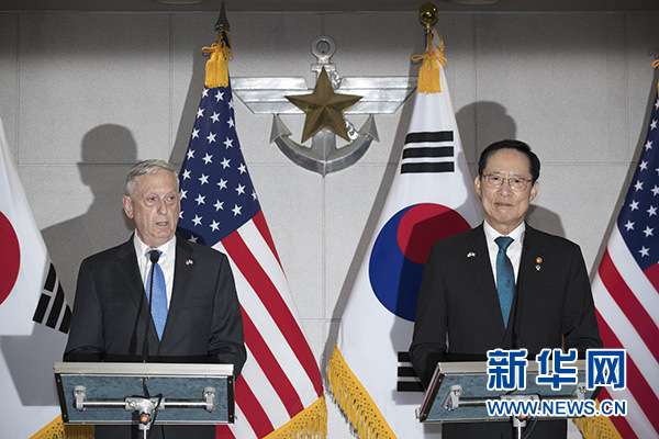 6月28日,在韓國首爾,韓國國防部長官宋永武(右)與到訪的美國國防部長馬蒂斯出席新聞發(fā)布會。新華社發(fā)(聯(lián)合采訪團供圖)