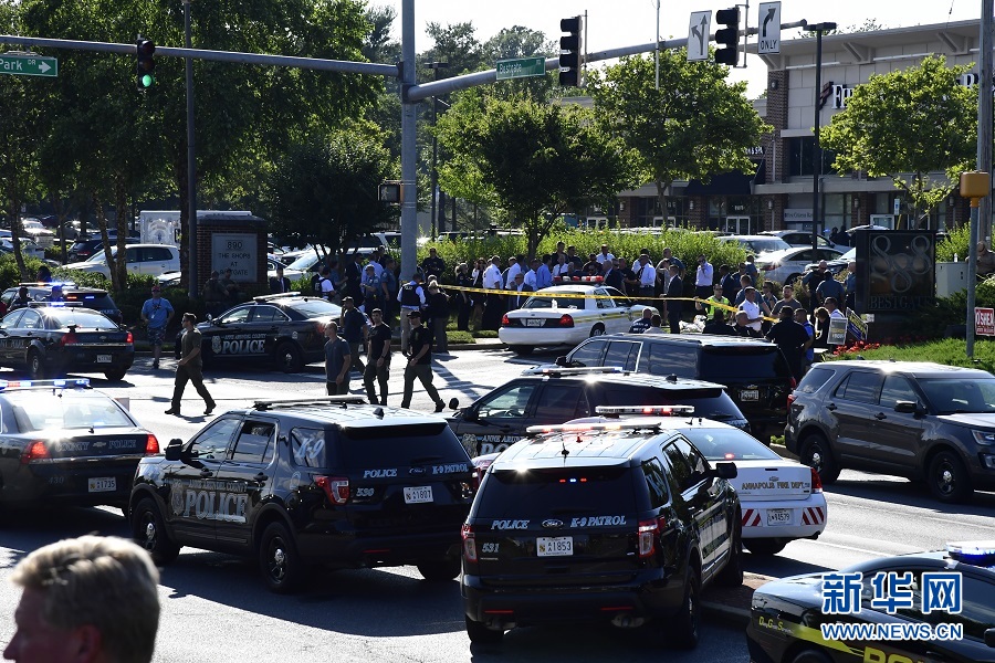 6月28日,在美國馬里蘭州首府安納波利斯,警方封鎖槍擊事件現(xiàn)場。馬里蘭州一家報紙的編輯室當日下午發(fā)生槍擊事件。當?shù)鼐秸f,槍擊事件已造成5人死亡,另有多人受傷。 新華社記者楊承霖攝