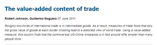 這家美國智庫的觀點(diǎn),也得到了來自歐洲的智庫“經(jīng)濟(jì)政策研究中心”2011年一篇報(bào)告的佐證。報(bào)告中的數(shù)據(jù)就顯示,如果貿(mào)易逆差是按照各個(gè)國家在產(chǎn)品中實(shí)際的“附加價(jià)值”計(jì)算的話,那么中美的貿(mào)易逆差將會(huì)大大縮減40%甚至更多。