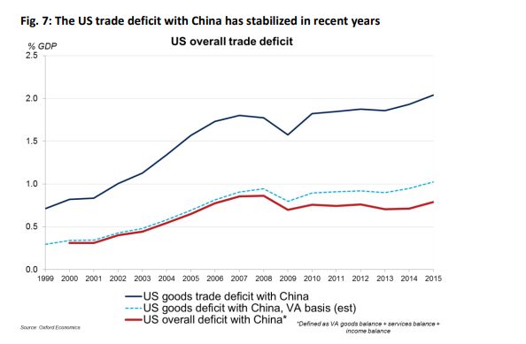 別看這個(gè)歐洲智庫的數(shù)據(jù)有點(diǎn)舊,在2018年的今天,情況還是一樣一樣的。美國CNBC上個(gè)月的一篇報(bào)道中就引用了來自牛津大學(xué)的數(shù)據(jù)稱,如果按照各國實(shí)際在貿(mào)易中的“附加價(jià)值”計(jì)算,中美現(xiàn)在3700億的貿(mào)易逆差會(huì)縮小一半之巨,即從美國GDP的2%縮小到1%——這已經(jīng)與歐盟相當(dāng)了。