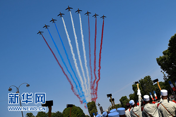 7月14日,在法國巴黎舉行的國慶閱兵儀式上,“法蘭西巡邏兵”飛行表演隊(duì)飛過香榭麗舍大街。新華社記者 陳益宸 攝