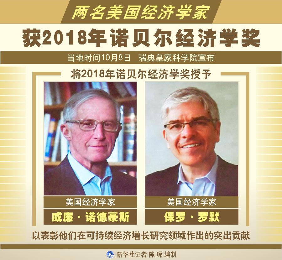 新華社斯德哥爾摩10月8日電(記者和苗 付一鳴)瑞典皇家科學(xué)院8日宣布,將2018年諾貝爾經(jīng)濟(jì)學(xué)獎(jiǎng)授予美國(guó)經(jīng)濟(jì)學(xué)家威廉·諾德豪斯和保羅·羅默,以表彰他們?cè)诳沙掷m(xù)經(jīng)濟(jì)增長(zhǎng)研究領(lǐng)域作出的突出貢獻(xiàn)。