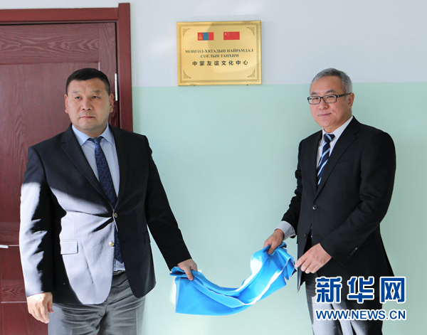 中國(guó)駐蒙古國(guó)大使館公使銜參贊楊慶東(右)和蒙古國(guó)中央省省長(zhǎng)巴特扎爾格勒為“中蒙友誼文化中心”揭牌。 新華社記者 阿斯鋼攝
