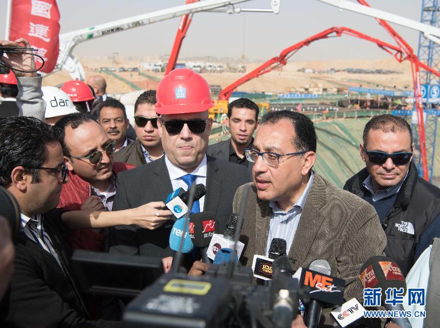 2月25日,在埃及開羅以東約50公里處的新首都中央商務(wù)區(qū),埃及總理穆斯塔法·馬德布利(右二)接受媒體采訪。 埃及總理穆斯塔法·馬德布利25日上午視察了由中國(guó)建筑股份有限公司承建的埃及新首都中央商務(wù)區(qū),并見證了標(biāo)志塔主樓1.85萬立方米超大型混凝土基礎(chǔ)底板開盤澆筑。埃及新行政首都中央商務(wù)區(qū)位于首都開羅以東約50公里處,總占地面積約50.5萬平方米,包含20個(gè)高層建筑單體及配套市政工程。 新華社記者鄔惠我攝