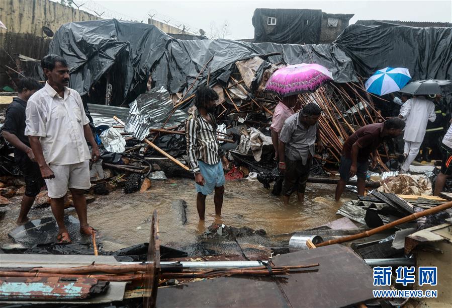 7月2日,在印度孟買,人們聚集在墻體垮塌事故現(xiàn)場。新華社發(fā)