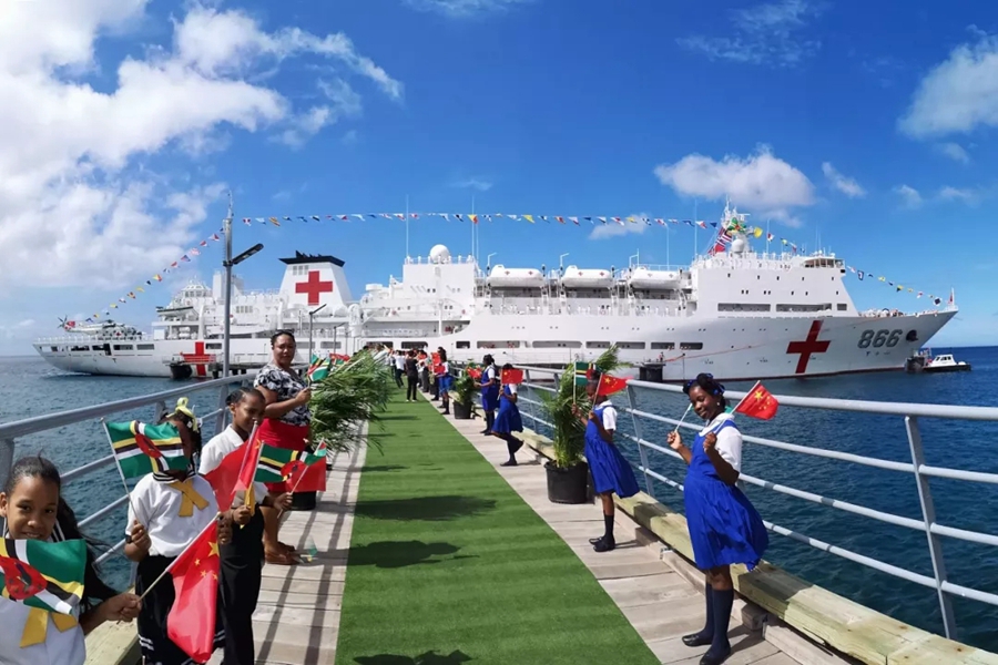 2018年10月12日,在多米尼克首都羅索,當(dāng)?shù)貙W(xué)生揮動(dòng)多中兩國(guó)國(guó)旗歡迎中國(guó)海軍和平方舟醫(yī)院船首次到訪。新華社發(fā)