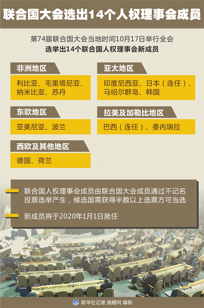 新華社聯(lián)合國10月17日電(記者尚緒謙)第74屆聯(lián)合國大會17日舉行全會,選舉出14個聯(lián)合國人權理事會新成員,以接替將于今年年底結束任期的成員。新成員將于2020年1月1日就任。
