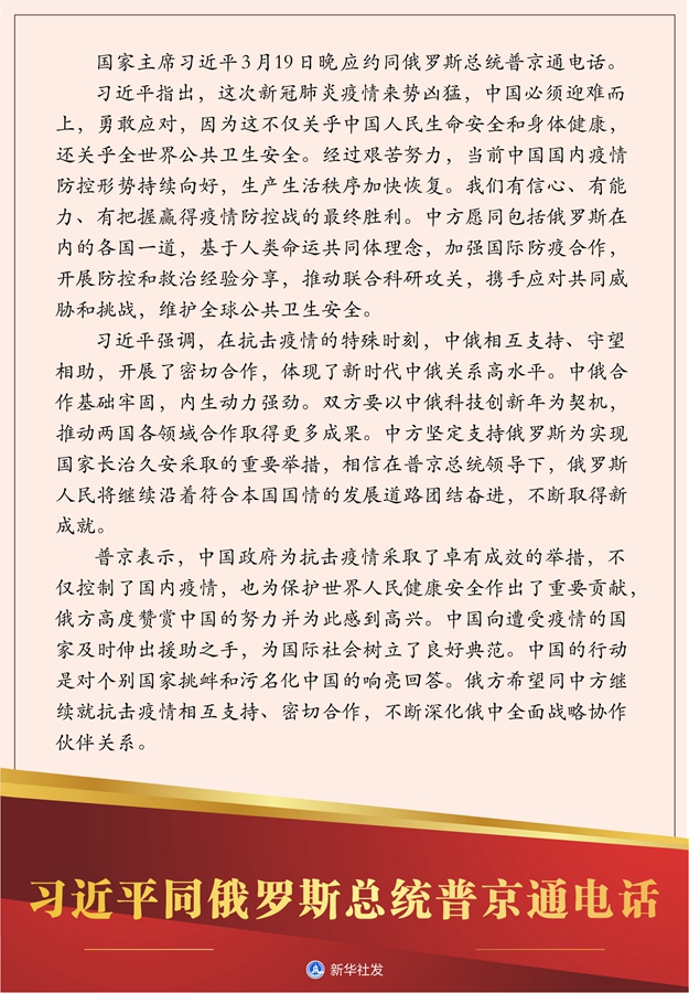 習(xí)近平指出,這次新冠肺炎疫情來勢兇猛,中國必須迎難而上,勇敢應(yīng)對,因?yàn)檫@不僅關(guān)乎中國人民生命安全和身體健康,還關(guān)乎全世界公共衛(wèi)生安全。經(jīng)過艱苦努力,當(dāng)前中國國內(nèi)疫情防控形勢持續(xù)向好,生產(chǎn)生活秩序加快恢復(fù)。我們有信心、有能力、有把握贏得疫情防控戰(zhàn)的最終勝利。中方愿同包括俄羅斯在內(nèi)的各國一道,基于人類命運(yùn)共同體理念,加強(qiáng)國際防疫合作,開展防控和救治經(jīng)驗(yàn)分享,推動聯(lián)合科研攻關(guān),攜手應(yīng)對共同威脅和挑戰(zhàn),維護(hù)全球公共衛(wèi)生安全。