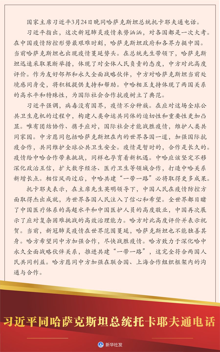 習(xí)近平強(qiáng)調(diào),病毒沒有國界,疫情不分種族。在應(yīng)對(duì)這場(chǎng)全球公共衛(wèi)生危機(jī)的過程中,構(gòu)建人類命運(yùn)共同體的迫切性和重要性更加凸顯。唯有團(tuán)結(jié)協(xié)作、攜手應(yīng)對(duì),國際社會(huì)才能戰(zhàn)勝疫情,維護(hù)人類共同家園。中方愿同包括哈薩克斯坦在內(nèi)的世界各國一道,加強(qiáng)國際抗疫合作,共同維護(hù)全球公共衛(wèi)生安全。疫情是暫時(shí)的,合作是長(zhǎng)久的。疫情給中哈合作帶來挑戰(zhàn),同樣也孕育著新機(jī)遇。中哈應(yīng)該堅(jiān)定不移深化政治互信,擴(kuò)大數(shù)字經(jīng)濟(jì)、醫(yī)療衛(wèi)生等領(lǐng)域合作,打造中哈關(guān)系新增長(zhǎng)點(diǎn)。相信風(fēng)雨過后,中哈共建“一帶一路”必將取得更多成果。
