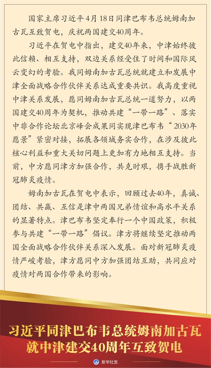 圖表:習近平同津巴布韋總統(tǒng)姆南加古瓦就中津建交40周年互致賀電 新華社記者 陳琛 編制