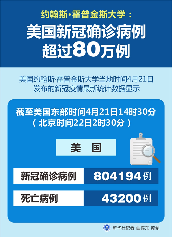 新華社紐約4月21日電? 美國約翰斯·霍普金斯大學21日發(fā)布的新冠疫情最新統(tǒng)計數(shù)據顯示,截至美國東部時間21日14時30分(北京時間22日2時30分),美國新冠確診病例升至804194例,死亡病例為43200例。