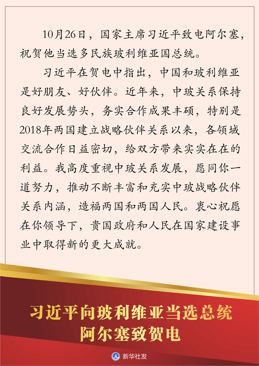 新華社北京10月26日電 10月26日,國家主席習(xí)近平致電阿爾塞,祝賀他當(dāng)選多民族玻利維亞國總統(tǒng)。